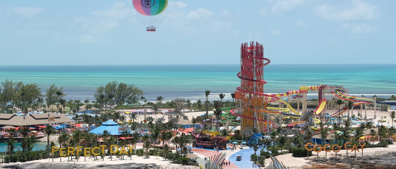 Perfect Day at CocoCay is Royal Caribbean's exclusive private island destination in the Bahamas. It offers visitors numerous exciting amenities such as the tallest waterslide in North America, a 1,600-foot long zip line, a tethered helium balloon ride offering stunning 450-foot high views, and Coco Beach Club with over-water cabanas. This island paradise is perfect for a day of adventure or relaxation under the sun.