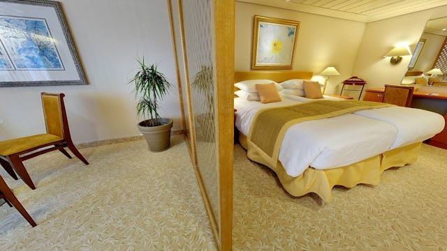 The elegant Owner's Suites on Highland Deck 10 of the Balmoral offer a spacious and well-appointed retreat. With a choice of twin or double bed, separate sitting and dining areas, and a luxurious bathroom with a bath and shower, guests have all necessary amenities. The suite also includes a walk-in wardrobe, a full-length private balcony with a large table, chairs, and sun loungers, and floor-to-ceiling windows offering scenic views. Access to a mini bar and fridge, along with the complimentary Suite Dreams package, enhance the stay for guests.