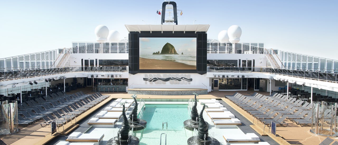 The pool deck where films screen under starry skies