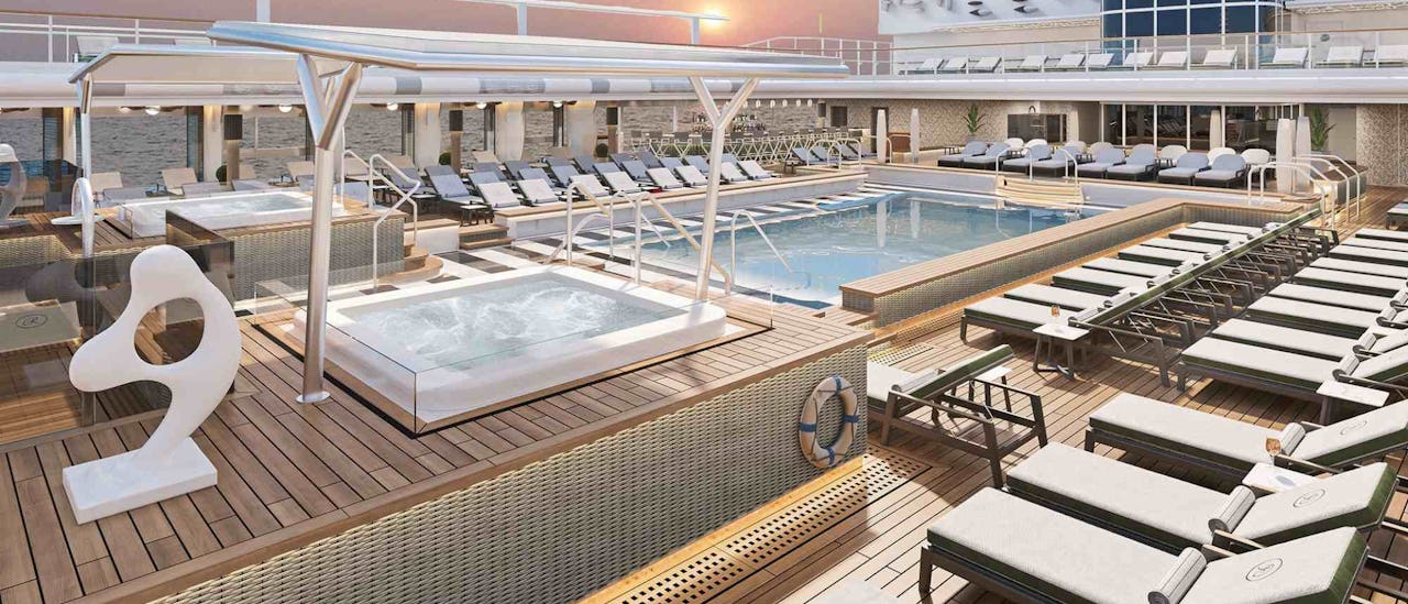 Seven Seas Grandeur™ spacious pool deck spans across two levels. Relax on a plush lounge bed next to the refreshing pool and whirlpools or on sunbathe on the top deck. Enjoy refreshing drinks delivered from the Pool Deck bar by a dedicated crew.