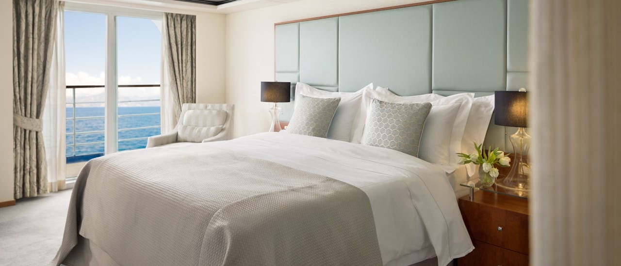 Each suite on Seven Seas Voyager has a private balcony featuring floor-to-ceiling windows, a sitting area, a roomy closet, and a spacious marble bathroom. Your comfort is taken to the next level with elegant touches like luxurious bedding, plush bathrobes, L'Occitane bath products, and a fully stocked mini-bar in-suite.