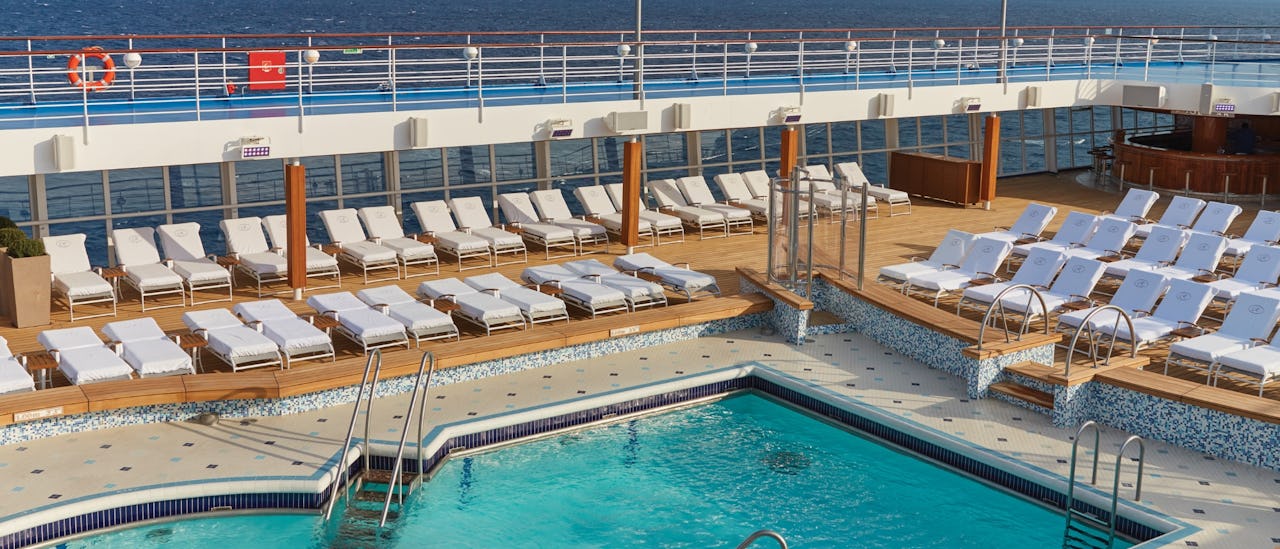 Head to Seven Seas Voyager Pool Deck where you will be welcomed by a spacious area with breathtaking views, comfortable lounges, and a friendly staff serving refreshing drinks at the Pool Bar. Enjoy a cocktail in the relaxed atmosphere or take a leisurely walk on the top deck to enjoy the refreshing open air.
