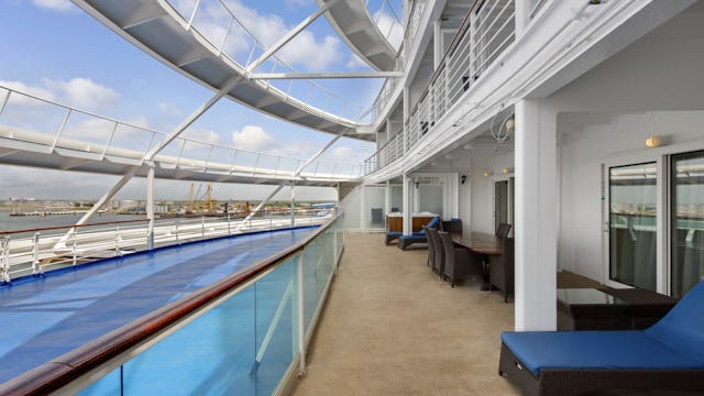 Relish the expansive Villa Suite on Liberty of the Seas®, with 1,302 sq. ft. of space, an 845 sq. ft. balcony, and room for 14 guests. This suite offers four bedrooms (convertible twin-to-Royal King beds), additional Pullman beds, a double sofa bed, and four bathrooms. Enjoy a dining area, a whirlpool on the balcony, and suite-exclusive benefits like priority check-in, concierge services, and more, all enhancing your opulent sea voyage.