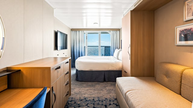 Relish the expansive ocean view and extra 80 sq. ft. balcony space in your 191 sq. ft. Ocean View cabins on Utopia of the Seas. Suitable for 4 guests with a Royal King bed, double sofa bed, vanity, sitting area, and bathroom. Enjoy the view at unbeatable value.