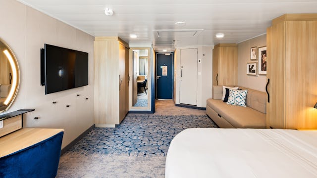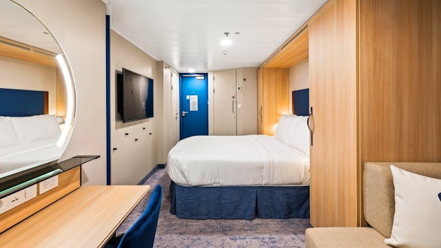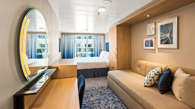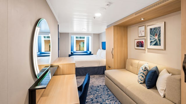 Unwind in the Spacious Interior cabins on Utopia of the Seas—269 sq. ft. of comfort. Accommodates up to 6 with convertible twin beds (Royal King), a double sofa bed, and bunk beds. Features include a sitting area with sofa, vanity, and a bathroom.