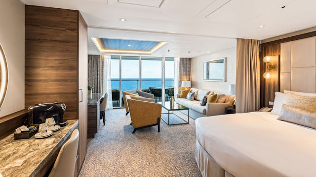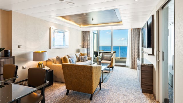 Experience unparalleled luxury on the new Utopia of the Seas℠ with The Solarium Suite, offering breathtaking 280-degree views from the front of the ship. Wake up to endless blue vistas from the well-appointed bedroom and enjoy panoramic ocean views from the expansive living and dining area. With just the push of a button, invite the refreshing ocean breeze in. Your Royal Suite Class Star status grants you VIP access ship-wide, inclusive amenities, and personalised surprises curated by your Royal Genie. Indulge in the ultimate suite experience on board with The Solarium Suite - where luxury meets extravagance.