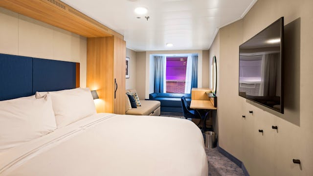 Experience the vibrant Royal Promenade through bowed windows in our Promenade View Interior cabins on Utopia of the Seas. Occupancy for up to 4 with beds that convert to a Royal King, a double sofa bed, a vanity, sitting area with sofa, and a bathroom.
