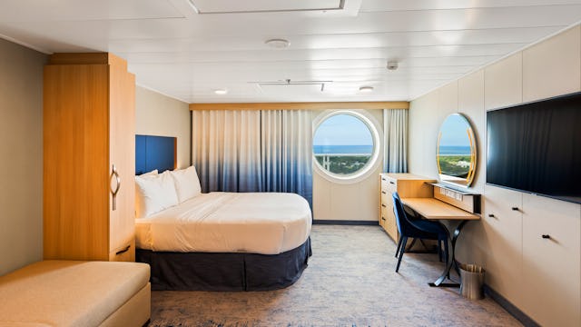 Relax in a Central Park View Interior stateroom on Utopia of the Seas, with a window facing the serene, tree-lined Central Park. Comfortably sleeps up to 4, featuring convertible twin beds to a Royal King, a double sofa bed, vanity, sitting area, and bathroom.