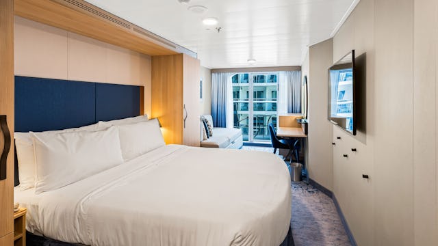 Savor serene Central Park views from the private balcony of our 191 sq. ft. Central Park View cabins on Utopia of the Seas. Accommodate up to 4 with a Royal King bed and double sofa bed. Includes a sitting area, vanity, and bathroom. Note: Views may be obstructed.