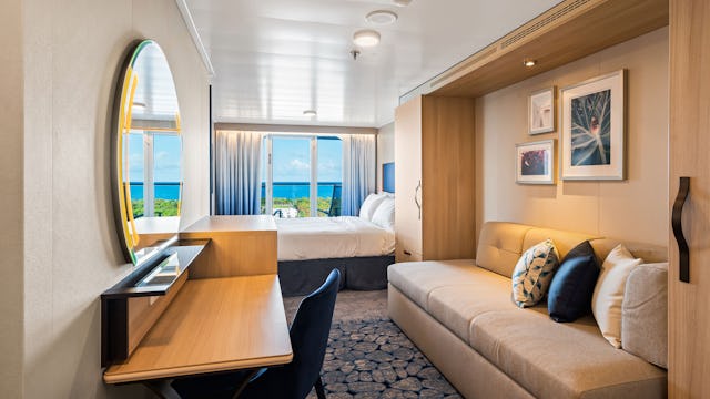 Stay in our vast Ultra Spacious Ocean View cabins on Utopia of the Seas, perfect for families, accommodating up to 6 guests. Spanning 285-364 sq. ft., it features a Royal King bed, a double sofa bed, bunk beds, a sitting area, and a bathroom. Ocean views may vary.