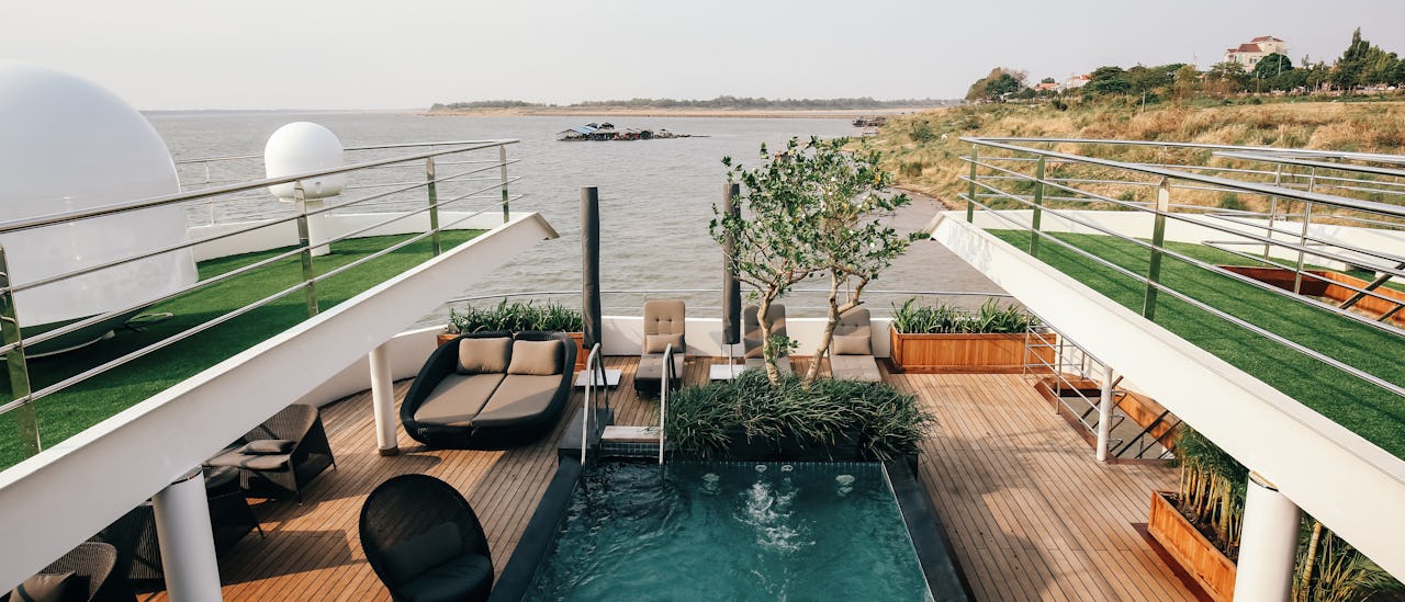 Scenic’s Mekong River cruises take place aboard Scenic Spirit, a 279-foot vessel that was launched in 2016 and can accommodate 68 passengers in 34 one-bedroom balcony suites. The Scenic Spirit, offers an almost 1:1 staff-to-guest ratio and is equipped with a sleek swimming pool, a steam sauna, and an open-air cinema.