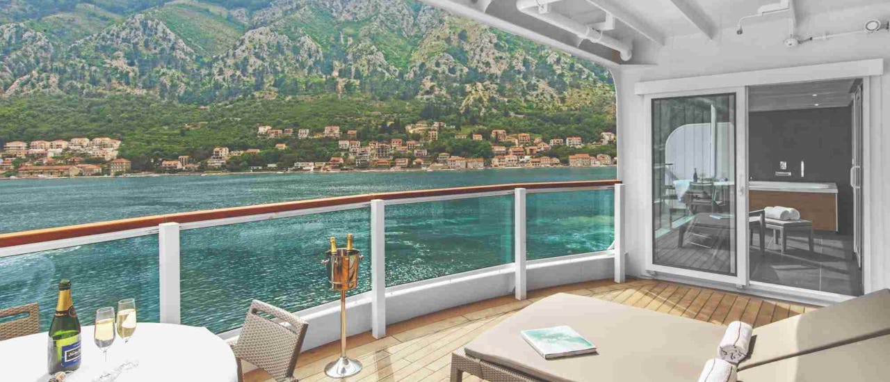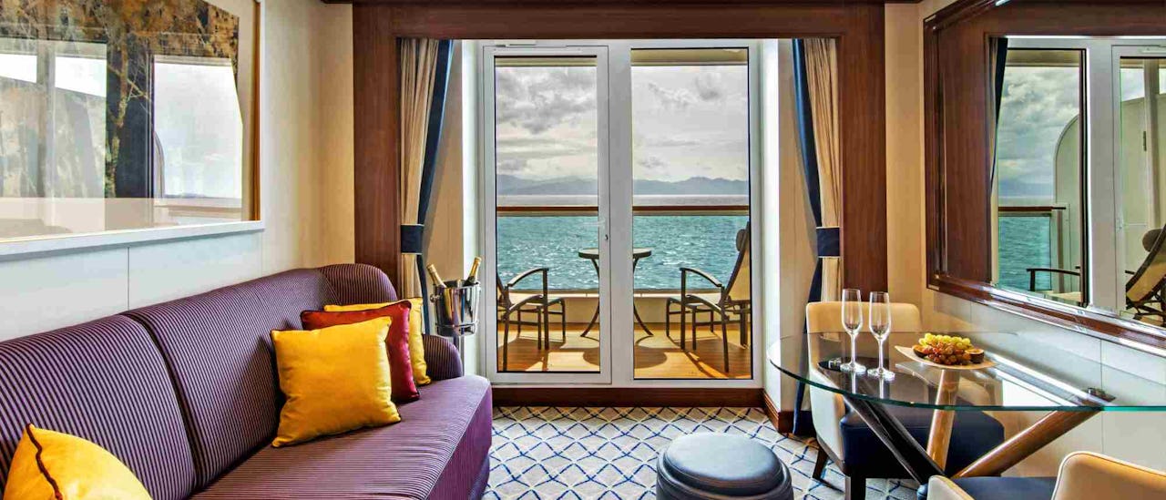 Seabourn Ovation offers all ocean-front suites with private balcony. The suites are elegant and feature premium amenities.