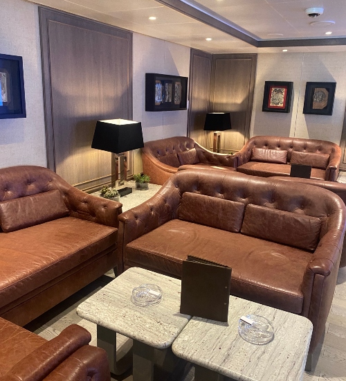 Next, we ducked into the The Connoisseur’s Corner, a small, intimate cigar lounge tucked away with chic leather sofas, rich wood accents, and vintage charm. Guests can purchase premium cigars and brandies here, making it perfect for those looking for a refined evening ritual.