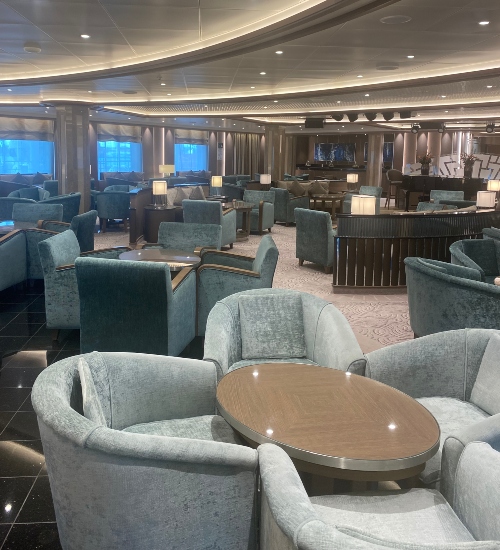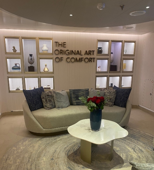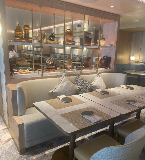 The first thing that struck me was the ship’s interior design – a calm and contemporary palette of soft pinks, greys, and light tones that lend a sense of serenity and spaciousness. The atmosphere feels more like a chic luxury hotel than a traditional cruise ship, with natural light flooding in at every opportunity.