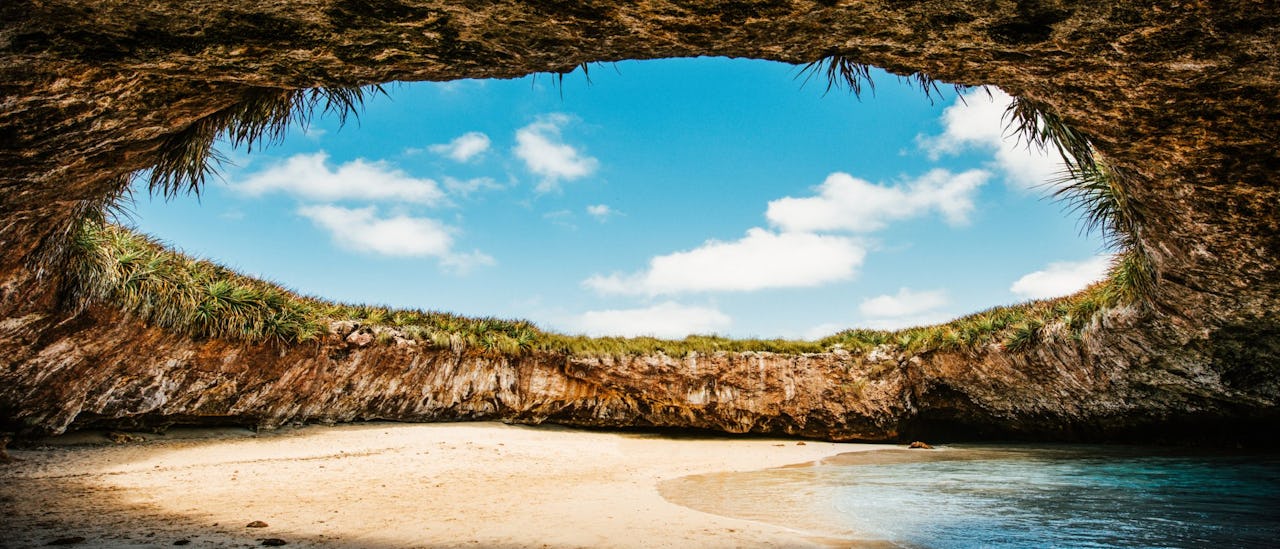 Discover the serene allure of Hidden Beach, an enchanting secluded sanctuary nestled within the Marietas Islands, off the coast of Puerto Vallarta, Mexico. This unique beach, also known as Playa del Amor or Lover's Beach, is beautifully entombed in a collapsed volcanic cavern, accessible only by swimming or kayaking through a short underwater tunnel. Upon arrival, you're rewarded with a sandy retreat ensconced by a ring of rocky cliffs under an open sky. This stunning natural phenomenom, coupled with the surrounding turquoise waters teeming with marine life, makes the journey an exciting part of the experience. Remember that visiting the Hidden Beach requires a special permit as the area is a protected national park.