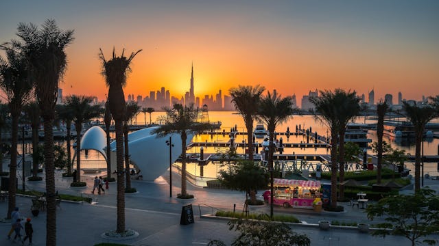 Dubai is located in the Middle East on the eastern coast of the Arabian Peninsula. It is one of the seven emirates that make up the United Arab Emirates (UAE). Geographically, it sits on the Arabian Desert, with the Persian Gulf to its north. The adjacent emirates bordering Dubai are Abu Dhabi in the south, Sharjah in the north-east, and the Sultanate of Oman in the south-east.