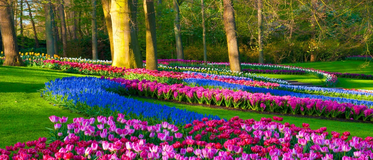 Keukenhof Gardens, also known as the Garden of Europe, is one of the world's largest flower gardens. It's situated in Lisse, Netherlands, around an hour's drive from Amsterdam. Keukenhof is internationally renowned for its stunning displays of tulips, though the garden grows numerous other varieties of flowers. The garden spans over 79 acres and is home to approximately seven million flowers, including about 800 different types of tulips. Keukenhof's breathtakingly colourful and diverse flower displays are arranged in beautifully manicured flower beds and fields, creating a picturesque and vibrant landscape admired by visitors worldwide.